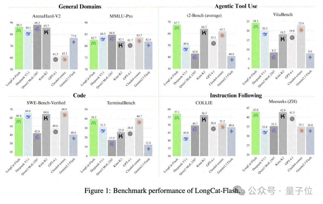 最终,LongCat-Flash在多类权威基准中处于第一梯队,在非思考大模型中与DeepSeek-V3.1等模型相当甚至更优。