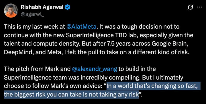 另一位MSL研究员Rishabh Agarwal也被小扎的毒鸡汤「劝退了」,官宣离职: