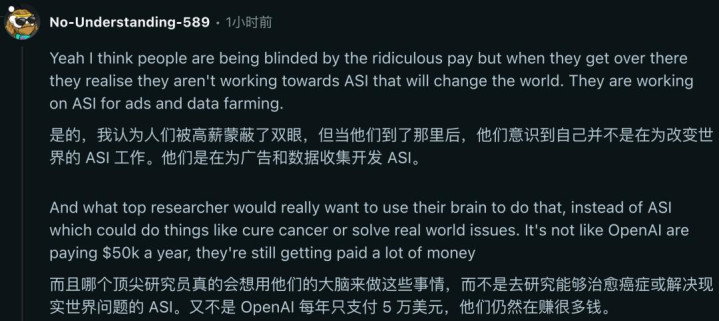 另一位网友解读,这些拿到高薪的人到了Meta后,才意识到自己并不是为改变世界的ASI工作,而是为广告和数据收集开发ASI。