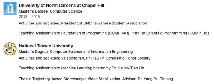 Tony Liu曾获得台湾大学计算机科学与信息工程硕士学位,以及北卡罗来纳大学教堂山分校计算机科学硕士学位。