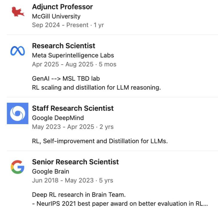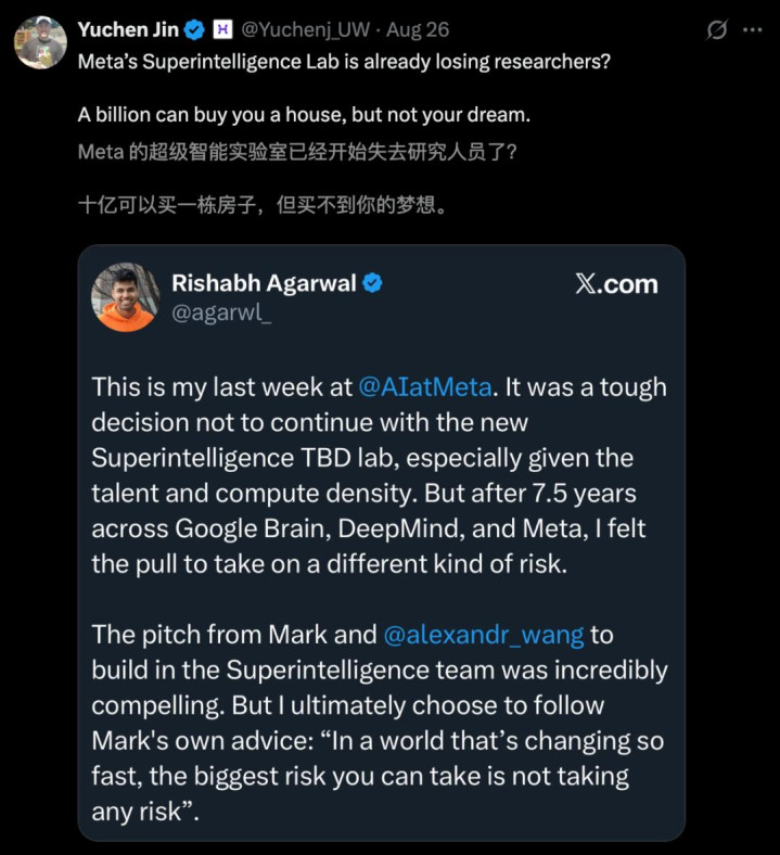 Rishabh Agarwal于今年4月份,以百万美元年薪加入Meta,仅仅五个月后,便闪离了。