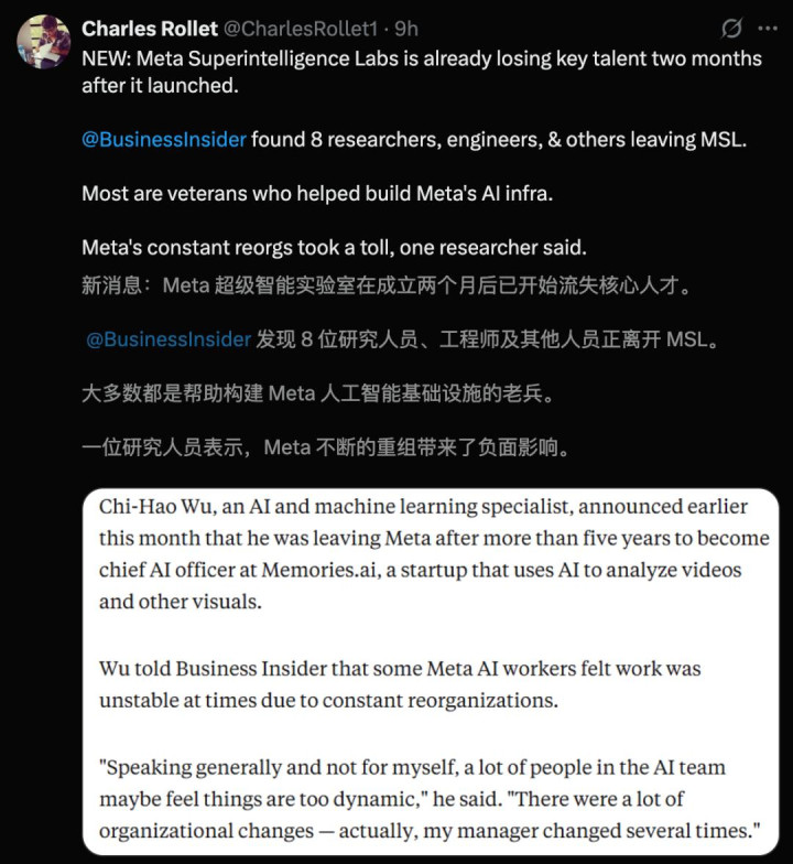 或许不止8人跑路,还有一些未被计入其中。如今,Meta大肆宣传的MSL,后院真的起火了。